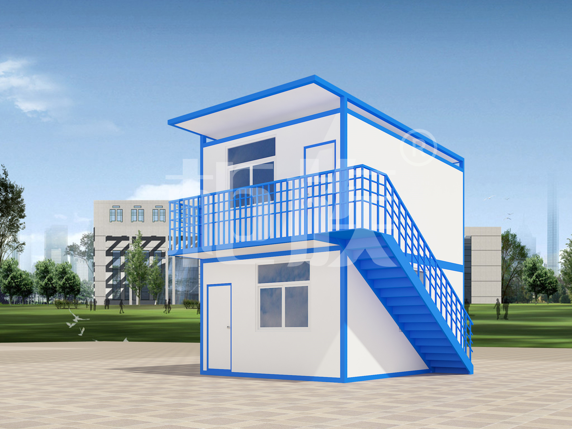 Multiple containers are spliced together, the blue and white appearance is simple and smooth. Factory production, finished products are directly transported to the use of the site, complete supporting facilities, ready to use.